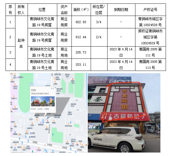 該戶債權(quán)抵押物原為吉龍賓館,總抵押面積1635.37平米。抵押物位于青銅峽市中心地段影劇院廣場,四周有青銅峽賓館、新華百貨、寧夏銀行、文化館等地標建筑,距青銅峽市政府、步行街2千米左右。周邊生活配套完善,商業(yè)氛圍及生活氣息濃厚,交通便利,地理位置優(yōu)越,適合經(jīng)營酒店賓館等,運營和增值能力較強,具備良好商業(yè)價值和現(xiàn)金回收水平。該債權(quán)已訴訟執(zhí)行,無司法障礙。